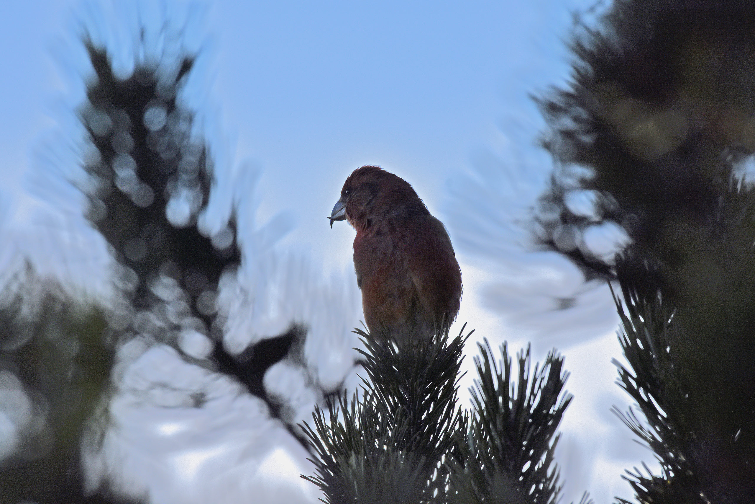 Pendant que Cécile fait une pose, deux Becs-croisés des sapins se posent dans l’ombre à contre-jour. Je tente trois photos sans avoir le temps de peaufiner les réglages et ils repartent.