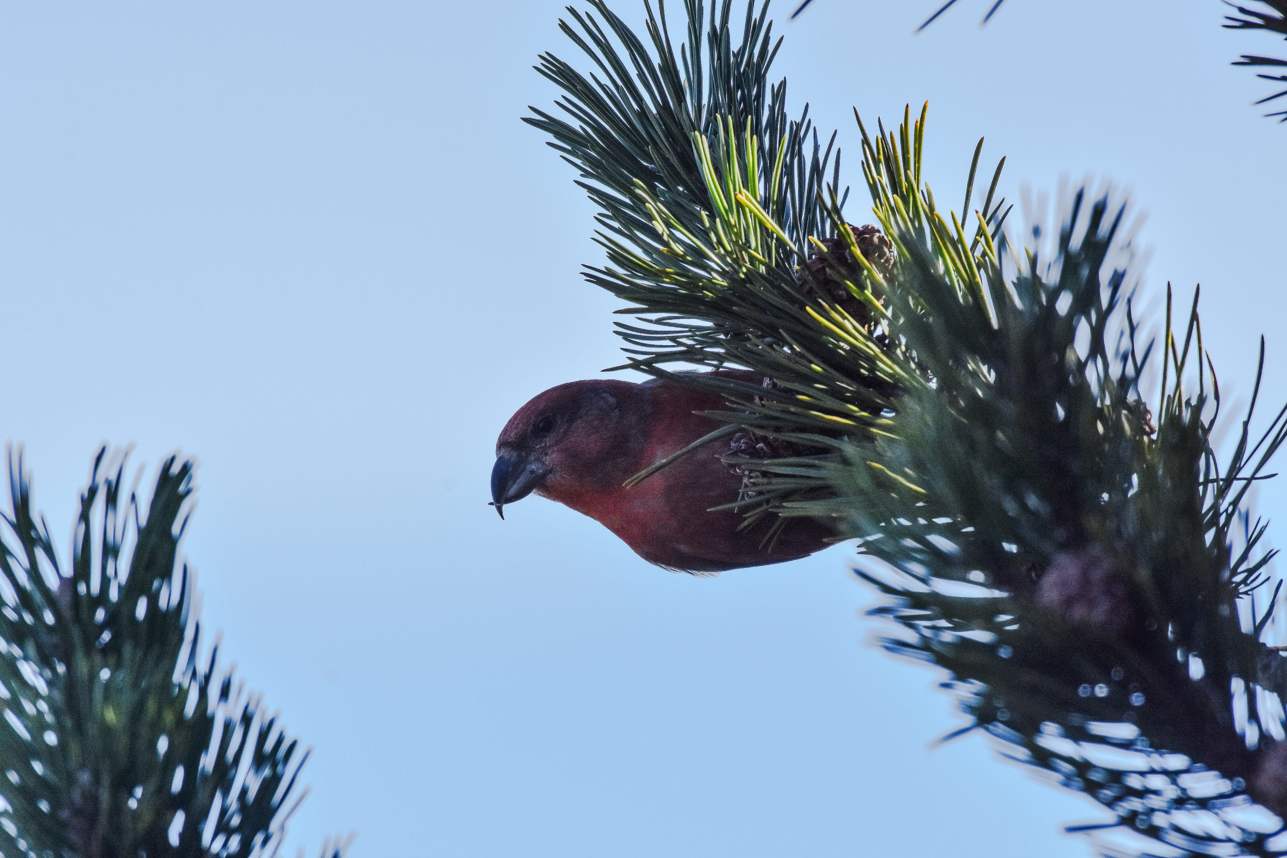 La couleur rouge de leur plumage indique que ce sont des mâles. Curieuse adaptation du bec de ces fringilles* qui leur permet de saisir les graines des cônes de conifères. Le jour où j’aurai de meilleurs clichés, je ferai un article sur cet oiseau.