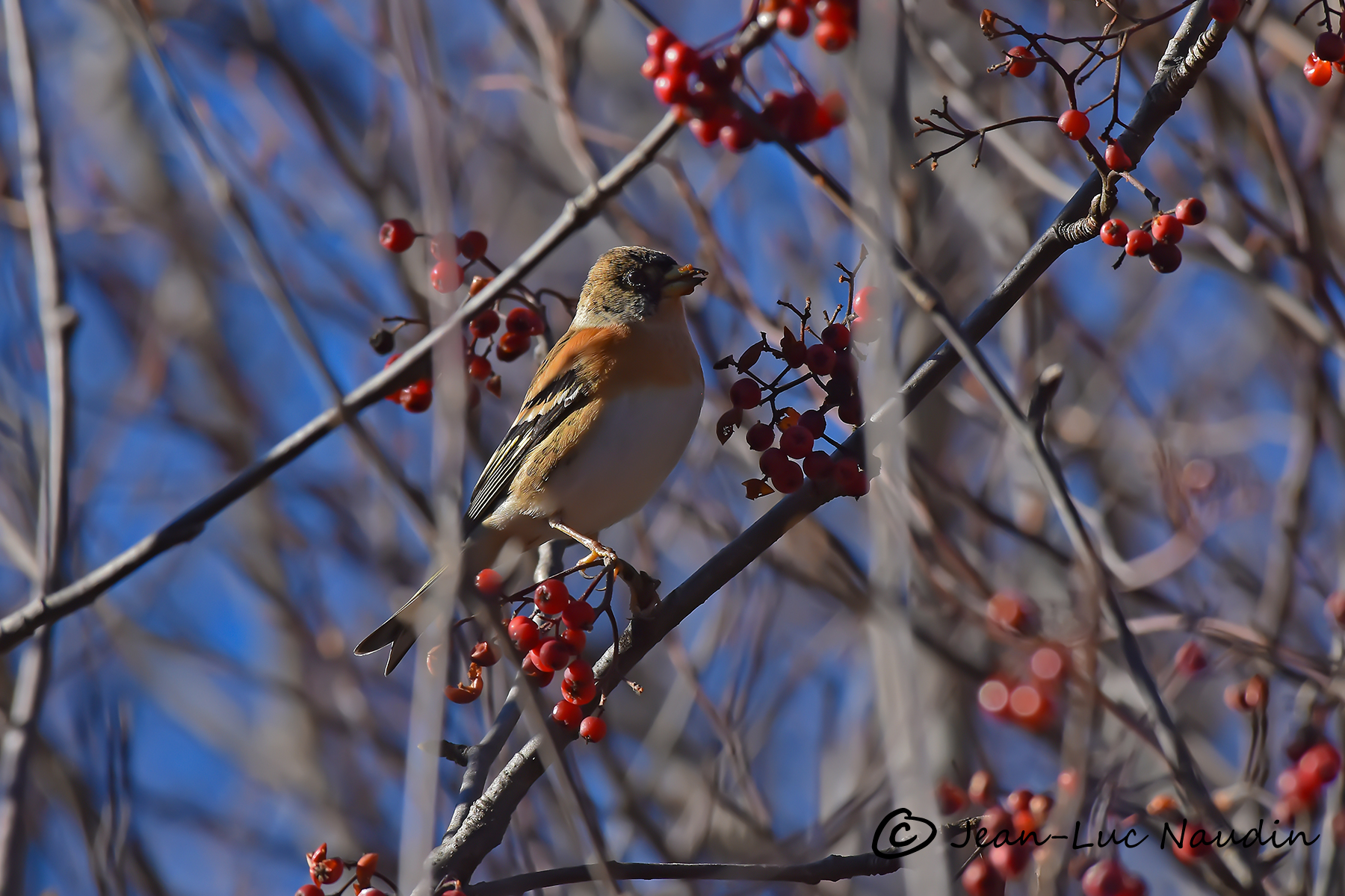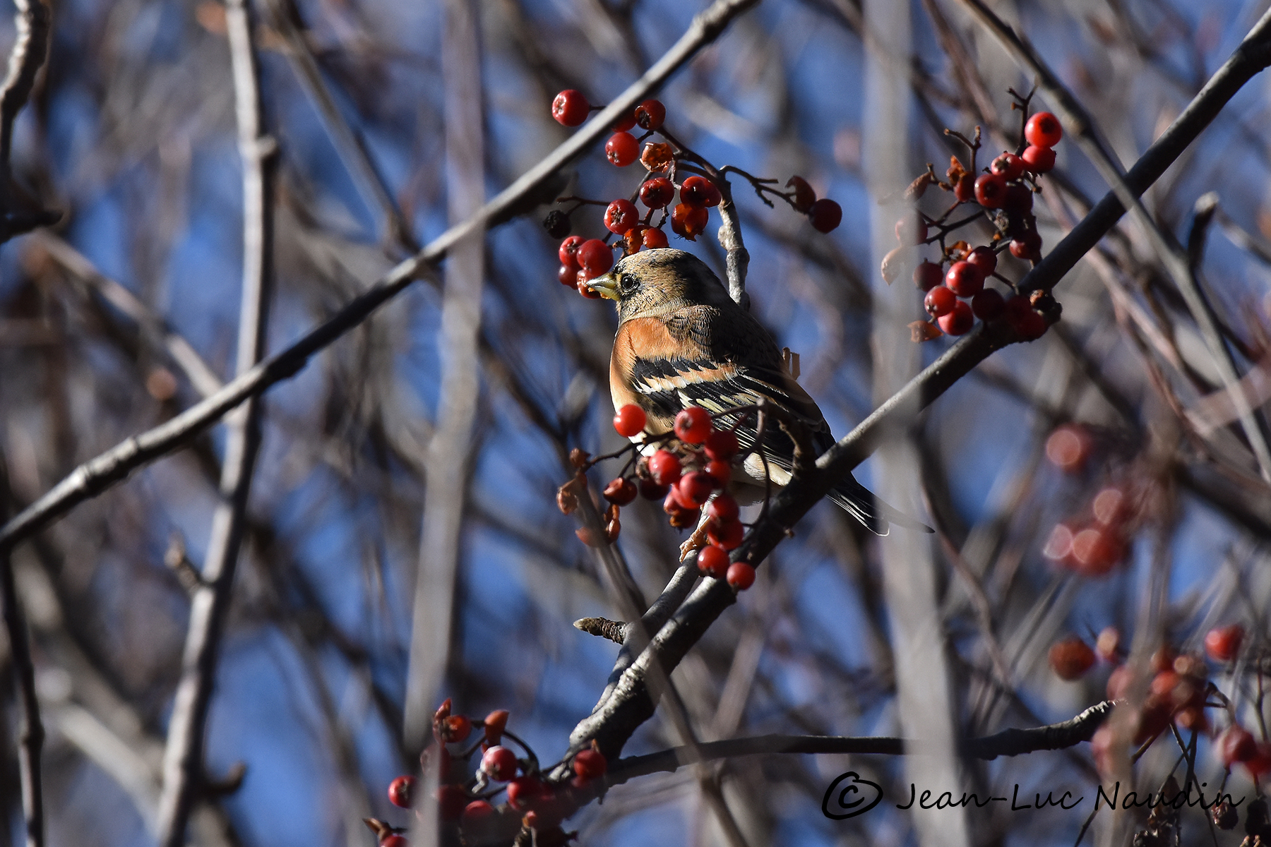 Dans un Alisier blanc, deux pinsons y mangent ses baies rouges. Un coup de jumelles et ce sont des Pinsons du Nord que nous observons. Difficile de les cadrer au milieu du fouillis de rameaux. De plus, ils sont à contre-jour.
