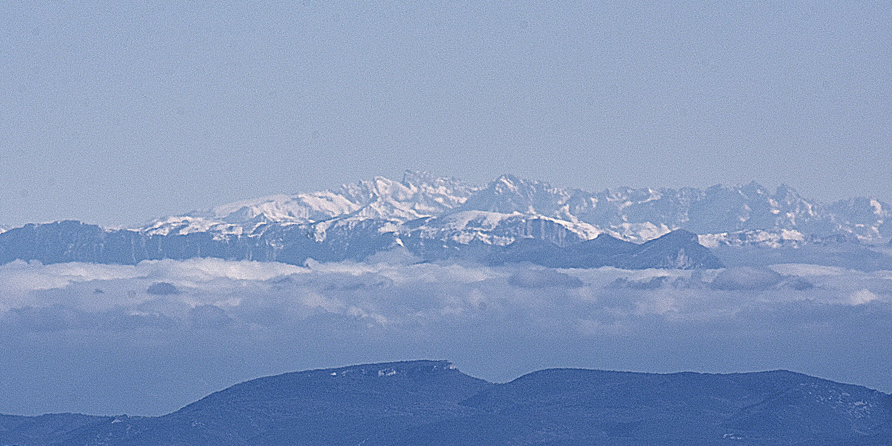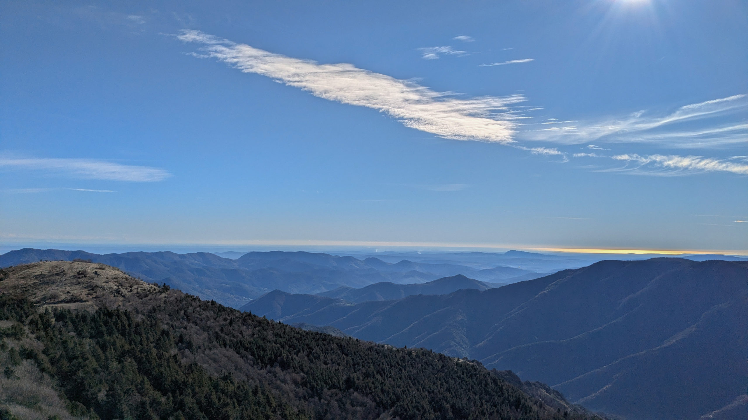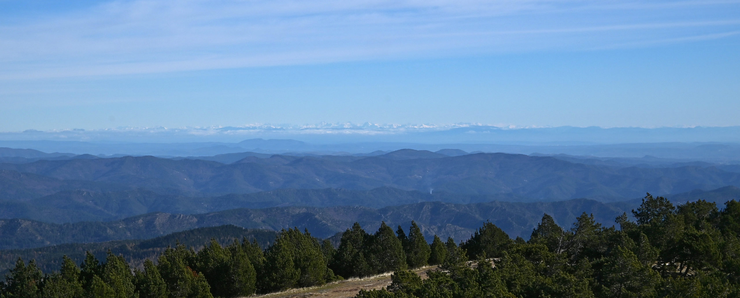 Nous montons en haut de la tour panoramique et sommes saisis, non par le froid mais par la vision. Ce ne sont pas des nuages au loin mais les chaînes enneigées des Alpes et des Pyrénées. Jamais nous n’avons vu aussi nettement ces montagnes. Au sud la mer est bien visible avec les étangs côtiers. Au lever du soleil, la vue devait être encore plus précise. D’après des randonneurs présents, ce n’est pas si souvent que le panorama soit aussi dégagé. Les sommets enneigés doivent se trouver à environ 220 km au minimum. En direction du Cantal et du Puy de Dôme, les monts du Cantal et le massif du Sancy, enneigés eux aussi sont visibles. Merci à l’anticyclone !