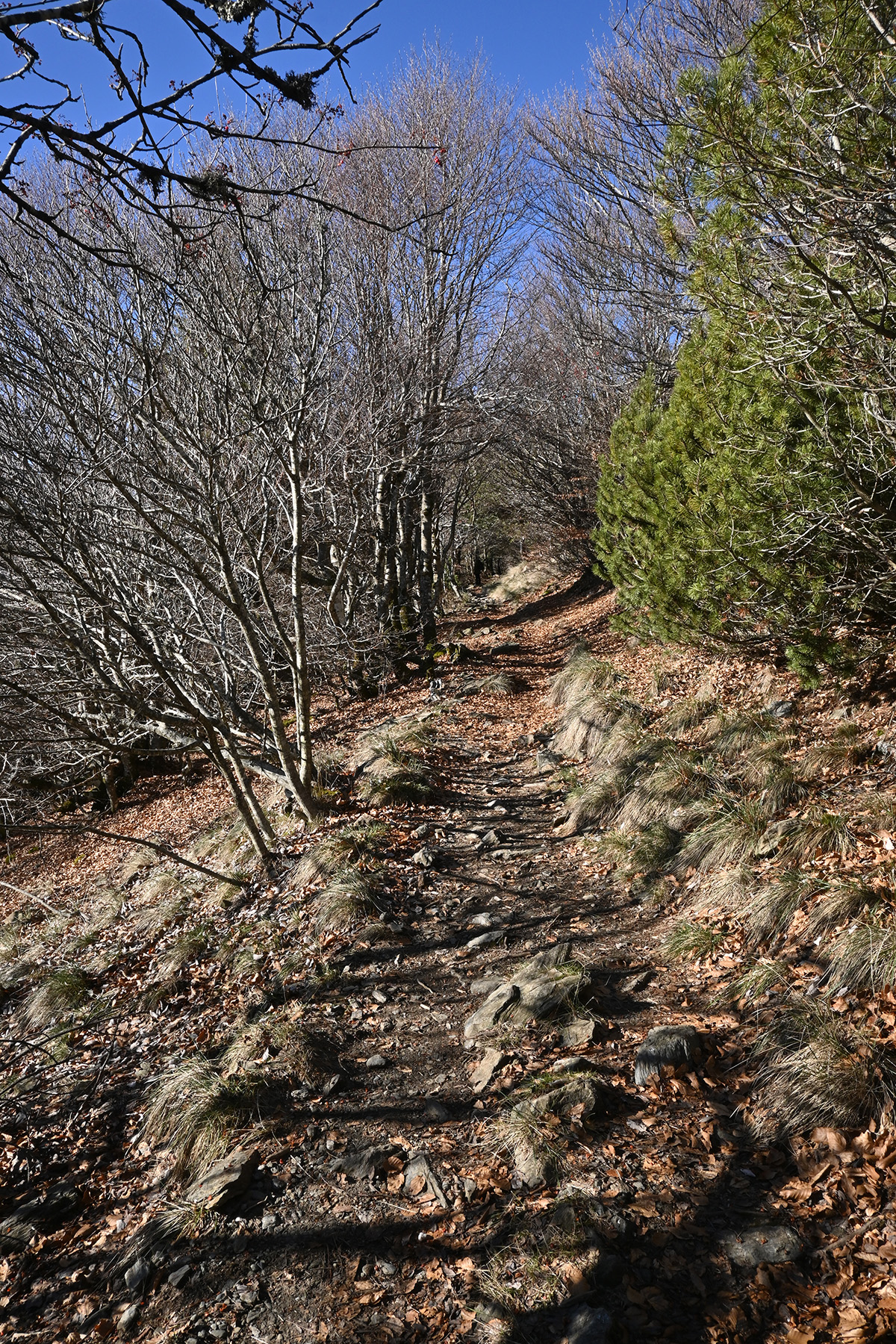 Nous remontons vers le sommet par un chemin bordé de cépées de hêtres tortueux.