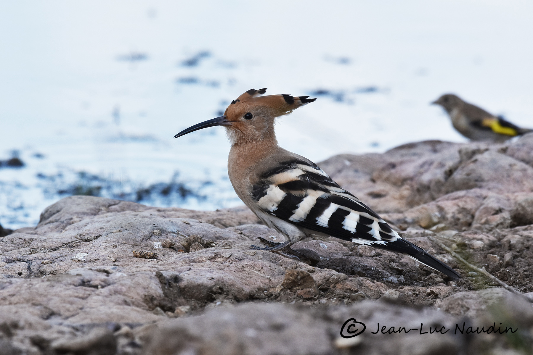 Huppe fasciée avec un jeune chardonneret en arrière plan