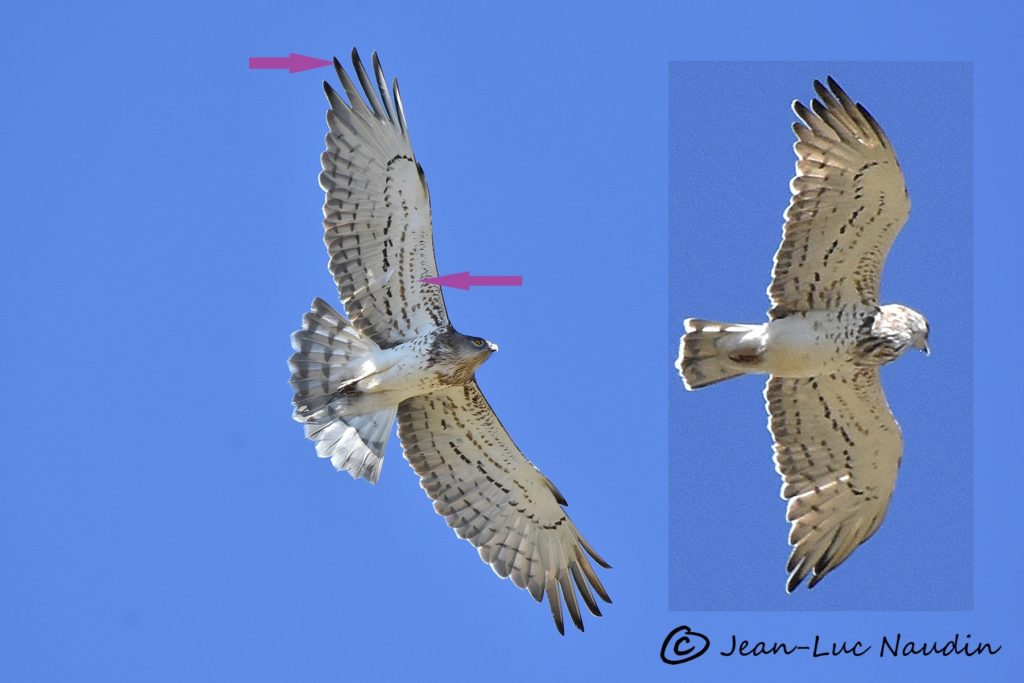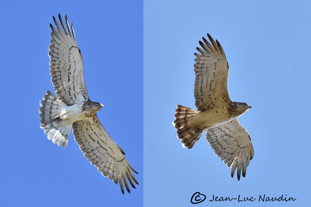 Pour la petite histoire, deux jours après au même endroit je photographie un circaète très semblable (photo de droite) mais différent par certains détails de sa poitrine.