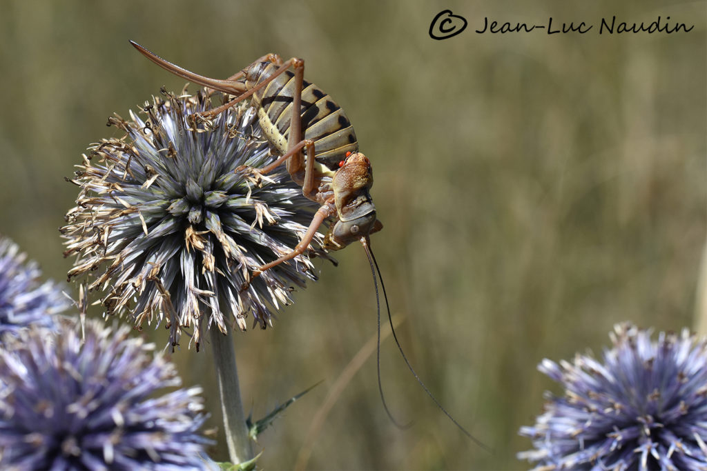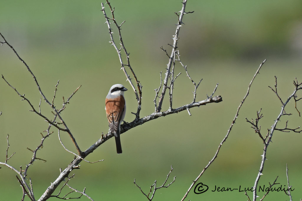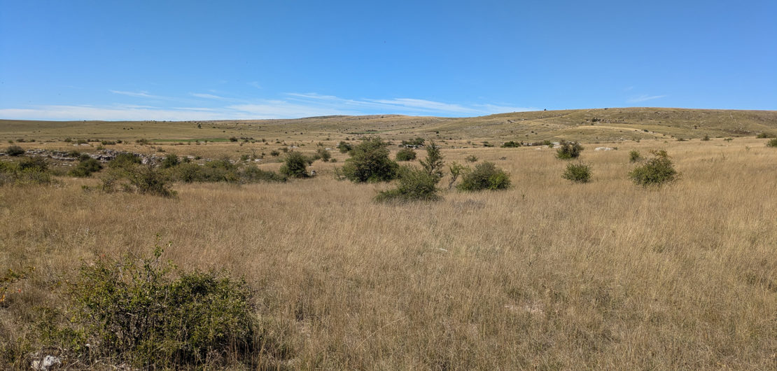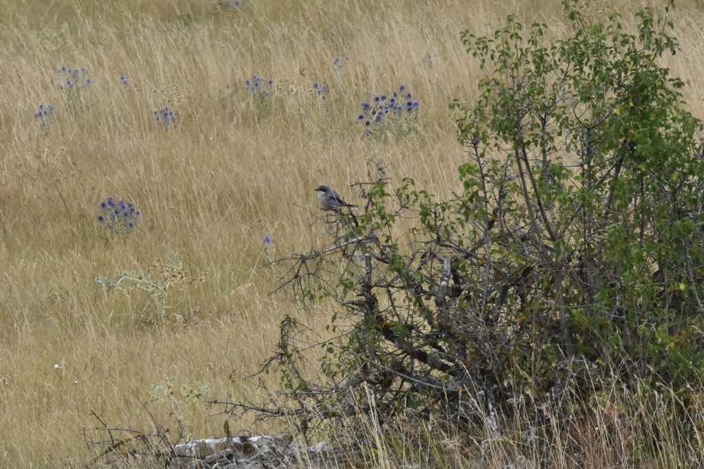 Nouvelle doline, encore une méridionale, dans celle d’après aussi mais également quatre Tariers des prés posés dans les buissons. C’est la période de migration vers les steppes de l’Afrique tropicale pour ce petit passereau devenu rare (non nicheur sur le Méjean). Inféodé aux prairies de fauche naturelles, il voit celles-ci progressivement remplacées par des cultures de ray-grass, sans diversité floristique (donc sans insectes), destinées à l’ensilage. Plus loin, une Pie-grièche écorcheur en migration ou une nicheuse locale qui n’a pas encore entamé son voyage vers l’Afrique orientale et méridionale au sud de l’équateur. L’écorcheur migre uniquement en utilisant une voie orientale par l’Italie, la Grèce voire la Turquie. Le large front migratoire passe essentiellement par l’Egypte.