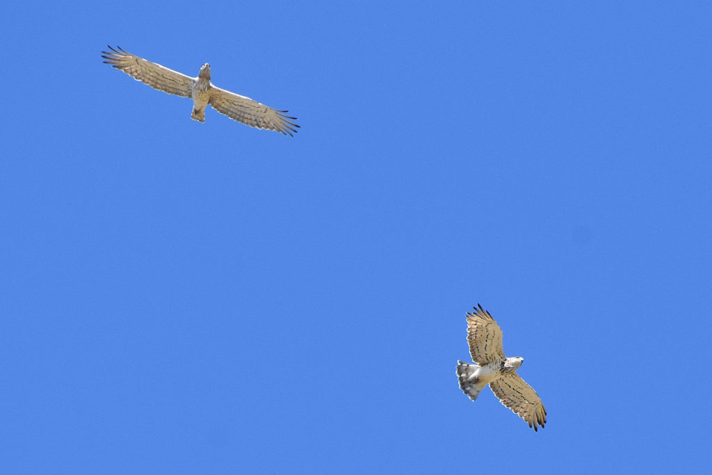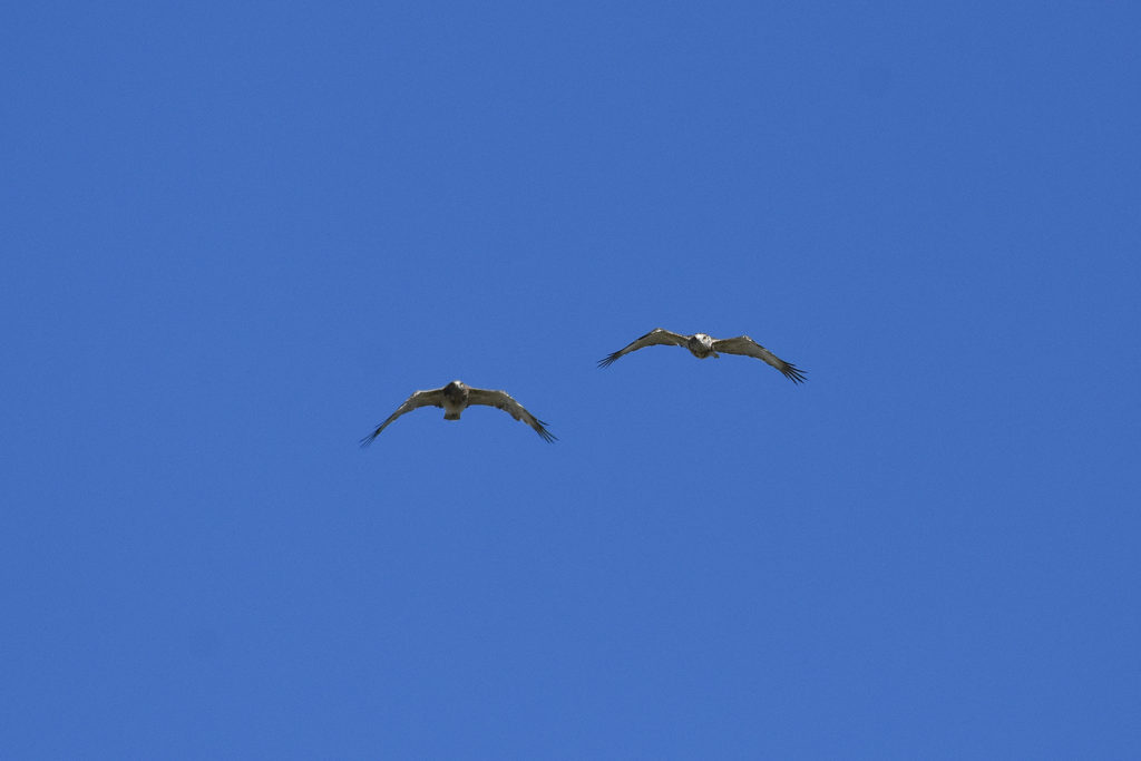 Des cris dans le ciel attirent notre attention, nous pensons aussitôt à des circaètes mais impossible de les voir. Encore un moment et nous voyons arriver deux individus.