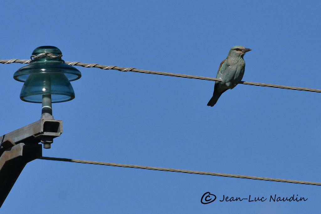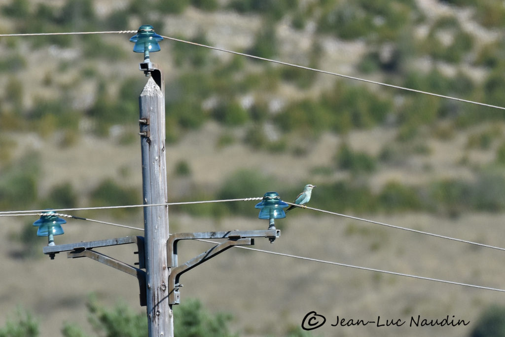 Nous partons maintenant vers un site où des Rolliers d’Europe ont été aperçus depuis le 25 août. Arrivés sur place nous ne tardons pas à en localiser un qui chasse depuis une ligne électrique. Nous en observons deux autres un peu éloignés et encore une Pie-grièche méridionale. Pour la petite histoire, un ornithologue a noté le même jour, 2 rolliers sur le site où nous avons piqueniqué à 13h, nous n’avons rien vu !
