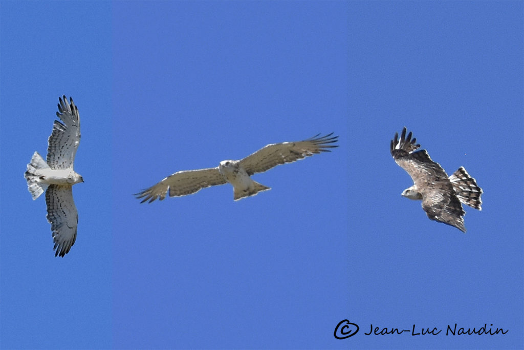 Un des circaètes est adulte (en haut à gauche), il vole la queue relevée et le cou tendu, signe d’une certaine excitation. C’est le plus clair (en bas à droite) donc le moins âgé qui plonge ensuite sur l’adulte. Après quelques « passes d’armes » les oiseaux se séparent sans se rapprocher de nous.